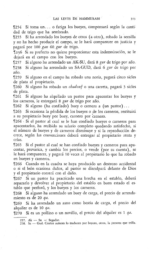 Aspecto. El Código de Hammurabi está grabado en una estela de diorita de 2,25 metros de altura. En la zona superior está representado Hammurabi en bajorrelieve, de pie, delante del dios del Sol de Mesopotamia, Shamash, el principal de la ciudad sumeria de Larsa. Debajo aparecen, inscritos en caracteres cuneiformes acadios, las leyes que regían la vida cotidiana. Contenido. Las leyes del Código de Hammurabi (numeradas del 1 al 282, aunque faltan los números 66–99 y 110–111) están escritas en babilonio antiguo y fijan diversas reglas de la vida cotidiana. Norman particularmente: La jerarquización de la sociedad: existen tres grupos, los hombres libres o "awilum", los "mushkenum" (quienes se especula podrían ser siervos o subalternos) y los esclavos o "wardum". Los precios: los honorarios de los médicos varían según se atienda a un hombre libre o a un esclavo. Los salarios: varían según la naturaleza de los trabajos realizados. La responsabilidad profesional: un arquitecto que haya construido una casa que se desplome sobre sus ocupantes y les haya causado la muerte es condenado a la pena de muerte. El funcionamiento judicial: la justicia la imparten los tribunales y se puede apelar al rey; los fallos se deben plasmar por escrito. Las penas: aparece inscrita una escala de penas según los delitos y crímenes cometidos. La base de esta escala es la Ley del Talión. Se tratan también el robo, la actividad agrícola (o pecuaria), el daño a la propiedad, los derechos de la mujer, los derechos en el matrimonio, los derechos de los menores, los derechos de los esclavos, homicidio, muerte y lesiones. El castigo varía según el tipo de delincuente y de víctima. Las leyes no admiten excusas ni explicaciones en caso de errores o faltas; el Código se ponía a la vista de todos, de modo que nadie pudiera alegar ignorancia de la ley como pretexto. Cabe recordar, sin embargo, que eran pocos (escribas en su mayoría) los que sabían leer y escribir en aquella época. Juicios sobre el código. Aunque el código sea la inspiración del «ojo por ojo, diente por diente» tiene artículos también muy alejados de ese concepto. Los artículos que constituyen el primer ejemplo de la llamada Ley del Talión son el 196 (el ojo), el 197 (el hueso) y el 200 (el diente). También pueden formar parte de este "revanchismo legal" los artículos 1, 2, 3 y, hasta cierto punto, el 21 y el 25. El resto establece indemnizaciones o penas graves, girando alrededor de temas distintos al "te hago lo que me hiciste". El código está inspirado por un alto sentimiento de orden. Las reglas de los contratos son todavía las establecidas por los sumerios. Se fija la responsabilidad mutua del amo y el obrero. Este tiene que recibir un salario mínimo y gozar de tres días de vacaciones cada mes. El Código es una simple recopilación de leyes sumerias, hecha por un rey, Hammurabi, sexto de los reyes de la primera dinastía babilónica, amorreo y semita aunque no sumerio. Hay bases para suponer préstamo directo de los babilonios a los hebreos, como las hay para ver inspiraciones en este Código por parte de la propia Roma. El código no debe dar la impresión negativa y simplista de la Ley del Talión. Entre otras cosas porque contribuye a mirar a los sumerios y babilonios (la Sumeria semita) como auténticos salvajes, cuando éstos son los asirios, que vinieron bastante después (Nínive), según los juzga la historia. En el código no se distingue entre derecho civil y penal, es decir, se dan leyes que regulan los asuntos de la vida cotidiana y leyes que castigan los delitos. Se regulan el comercio, el trabajo asalariado los préstamos, los alquileres, las herencias, los divorcios, la propiedad, las penas por delitos de robo, asesinato, etc. El texto del código también nos sirve para saber cuales eran los delitos más frecuentes en la época, pues un delito previsto será un hecho que acontece con relativa frecuencia. En las penas aplicadas a cada delito se distingue si hay intencionalidad o no, y cual es la "categoría de la víctima y la del agresor". Así la pena es mayor si se ha hecho adrede y menor si ha sido un accidente; mayor si la víctima es un hombre libre menor si es un esclavo. La mayoría de las penas que aparecen en el código son pecuniarias (multas), aunque también existe pena de mutilación e incluso pena de muerte. En algunos casos la ley opta por aplicar talión, es decir, hacer al agresor lo mismo que él hizo a su víctima siempre que ambos sean de la misma "categoría". |