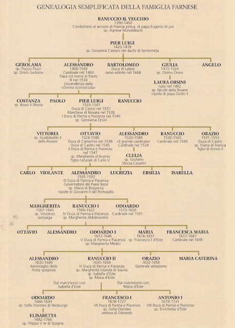 Juan de Médici o Giovanni di Bicci de' Medici (en italiano) (Florencia, 1360 - 20 de febrero de 1429) fue un banquero de la Edad Media, fundador de la poderosa familia Médici de Florencia, padre de Cosme de Médici (Pater Patriae) y bisabuelo de Lorenzo de Médici (El magnífico). Lorenzo de Juan de Médici conocido como Lorenzo el Viejo, (Florencia, c.1395 - Florencia, 1440), banquero italiano de la familia Médici, hermano menor de Cosme el Viejo y cabeza de la rama Popolano de la familia, que se hiciera más adelante conocida por su descendiente Cosme I de Médici, tras la extinción del ramo principal. Pierfrancesco de Lorenzo de Médici, conocido como El Viejo, (Florencia, 1430 - 19 de julio de 1476), banquero italiano de la familia Médici. Giovanni di Pierfrancesco di Medici, apodado "il Popolano", "El Populista", (Florencia, 21 de octubre de 1467 — Bagno di Romagna, 14 de septiembre de 1498) fue un miembro de la rama llamada "de los populistas" de la influyente familia florentina Médici, hijo de Pierfrancesco el Viejo y hermano menor de Lorenzo di Pierfrancesco de Médici. Juan de Médici o Giovanni de Médici (en italiano) o Giovanni de las Bandas Negras o Giovanni dalle Bande Nere (en italiano) (1498-1526) fue un célebre condotiero italiano del Renacimiento. Cosme I de Médici (Florencia, 12 de junio de 1519 – Villa di Castello, 21 de abril de 1574), II Duque de Florencia (1537-1569) y I Gran Duque de Toscana (1569-1574), durante los últimos años del Renacimiento. Fernando I de Médici, (Florencia, 30 de julio de 1549 - id., 17 de febrero de 1609), Tercer Gran Duque de Toscana entre 1587 y 1609. Quinto hijo del Duque Cosme I de Médici y de Leonor Álvarez de Toledo, fue ordenado cardenal en 1562, con catorce años de edad. Cosme (Cosimo) II de Médici (12 de mayo de 1590 – 28 de febrero de 1621) gobernó como IV gran duque de Toscana desde 1609 hasta 1621. Margarita de Médici (Florencia, 31 de mayo de 1612 – Parma, 6 de febrero de 1679) fue una noble italiana, duquesa consorte de Parma y Piacenza y esposa de Odoardo I Farnesio. Fue regente de Piacenza en 1635 y regente de todo el ducado en 1646, a la muerte de su marido. Ranuccio II Farnesio (en italiano: Ranuccio II Farnese) (Parma, 17 de septiembre de 1630 – Parma, 11 de diciembre de 1694), fue el sexto duque de Parma y Plasencia y séptimo duque de Castro. Eduardo II Farnesio (en italiano:Odoardo Farnese) (Colorno, 12 de agosto de 1666 – 6 de septiembre de 1693), heredero del ducado de Parma y Plasencia. Isabel Farnesio (Parma, 25 de octubre de 1692- Aranjuez, 10 de julio de 1766), fue una aristócrata italiana, reina consorte de España como segunda esposa del rey Felipe V y madre de Carlos III. |